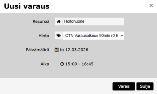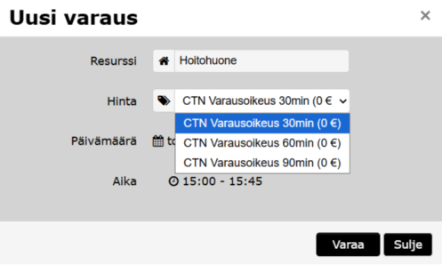 Valinnan tehtyä näet varauksen päivämäärän ja varauksen keston. Jokaiseen varaukseen sisältyy 15 min ylimääräinen, 5min ennen varauksen alkua ja 10min varauksen loppuun, aika jolloin käynnistät laitteet ja palautat tilan kuntoon ja siistiksi seuraava käyttäjää varten. Hoitohuoneeseen pääset 5min ennen varauksesi alkamista. Tarvittaessa voit varauksen aikana poistua hoitohuoneesta ja tulla takaisin, pääsyoikeus on voimassa koko varauksen ajan.