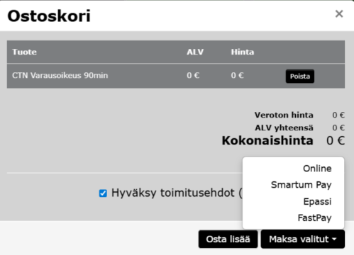 Että varaus aktivoituu valitse maksutavaksi ONLINE. Tämä ei johda uuteen maksuun vaan järjestelmän logiikan takia pitää tehdä tämä toimenpide.