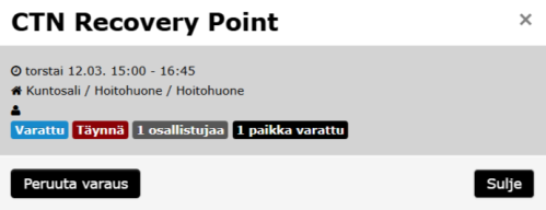 Jos joudut perumaan varauksen, klikkaa varaamaasi aikaa jolloin avautuu peruutus ikkuna. Ajanvarauksen peruuttamiseksi klikkaa PERUUTA VARAUS -painiketta